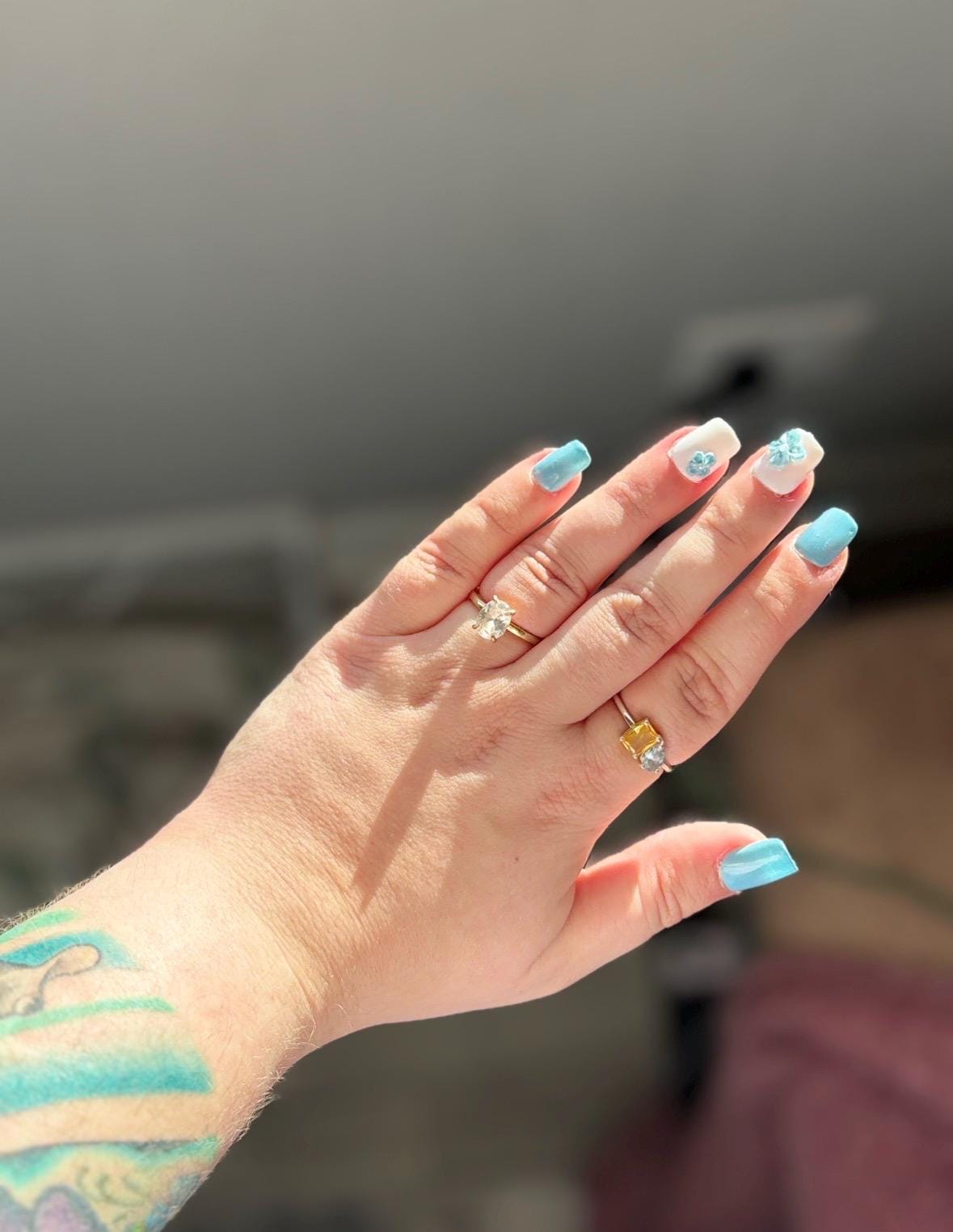 - Something Blue: a minimalistic soft, baby blue nail design with two small flowers and a pearly center.