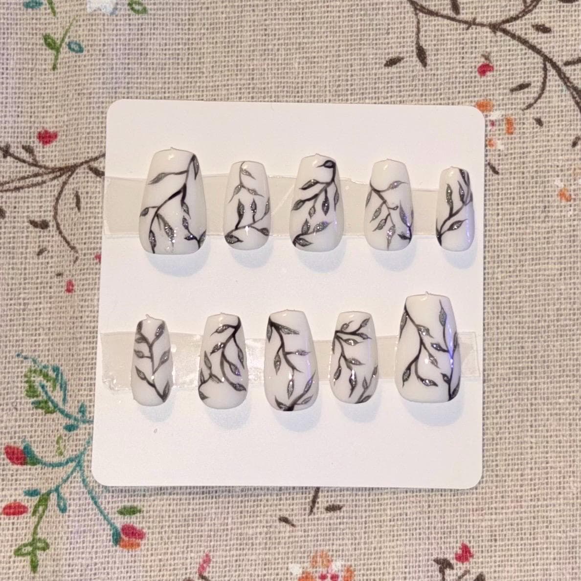 - Love Grows (Rosemary): a white design with a sparkly floral pattern on each nail. Flowers & vines will automatically be black & silver unless specified otherwise by buyer.